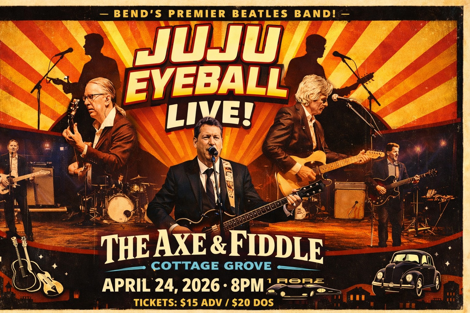 “Bend’s Beatle Band” since 2015 (voted “Central Oregon’s Best Cover Band” in 2021), Juju Eyeball’s energetic shows and top-notch musicianship hit the sweet spot with the audience from the first downbeat. Now a four-piece featuring Dan Larsson on bass/vocals, Kye Kennedy and Terence Barham on guitar/vocals, and Matthew Fletcher on drums/vocals, Juju Eyeball continues to please audiences at every show while they rock the most famous catalog in music history. Its members have toured with Grammy and Emmy winning artists, been on MTV, and people who saw the Beatles live back in the day have expressed amazement with what the band brings. You’re likely to hear your favorite, and no one’s stopping you from dancing. Party on, Jojo.